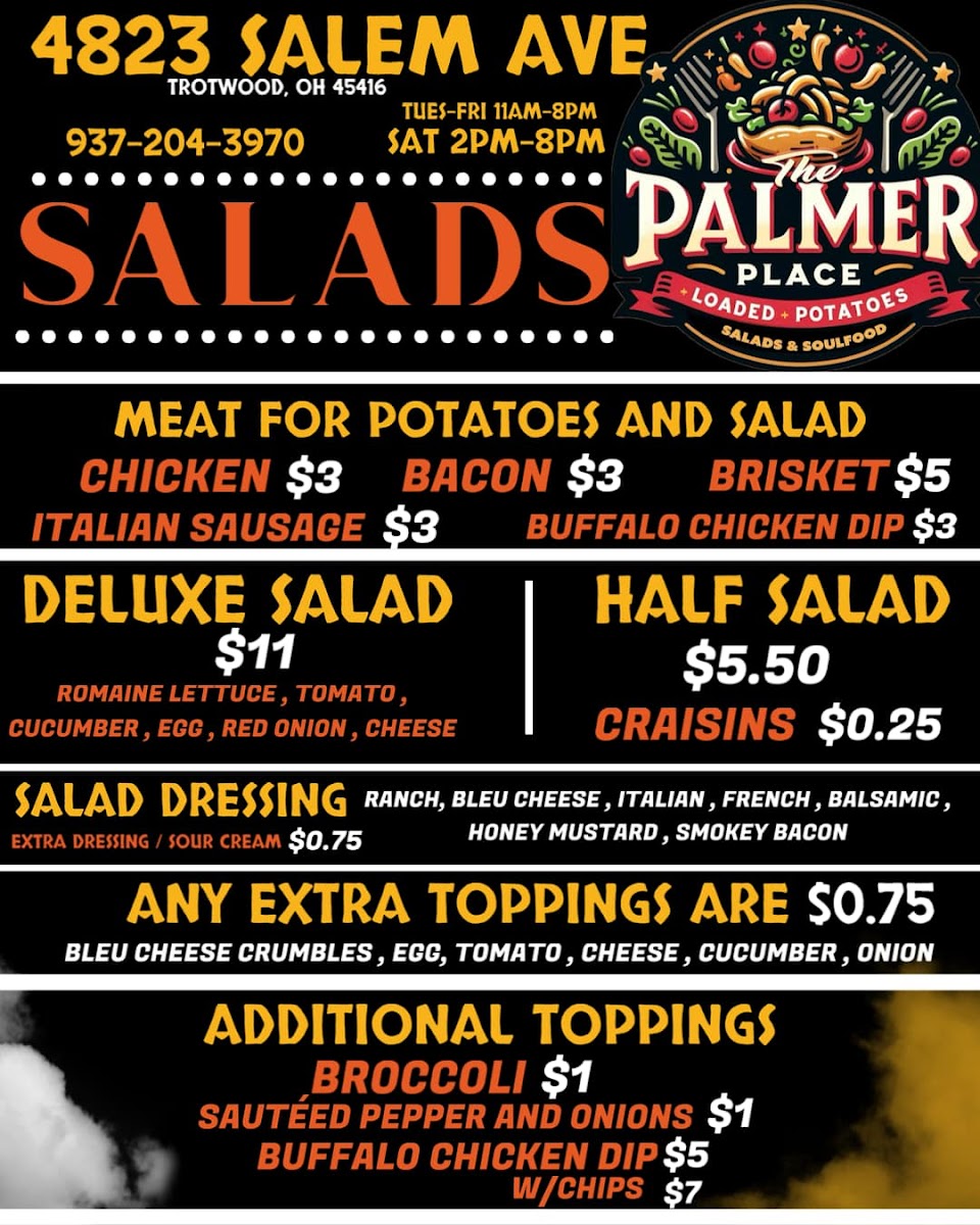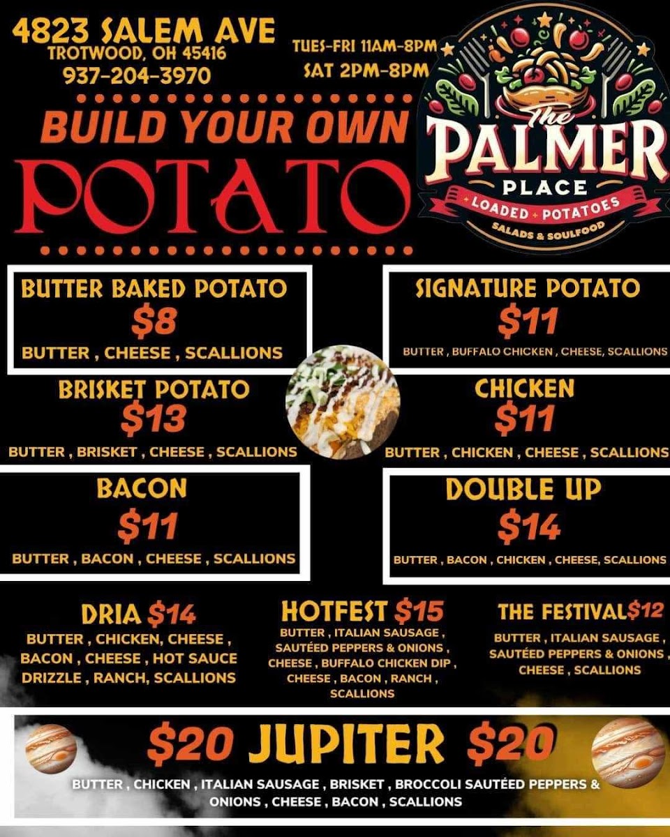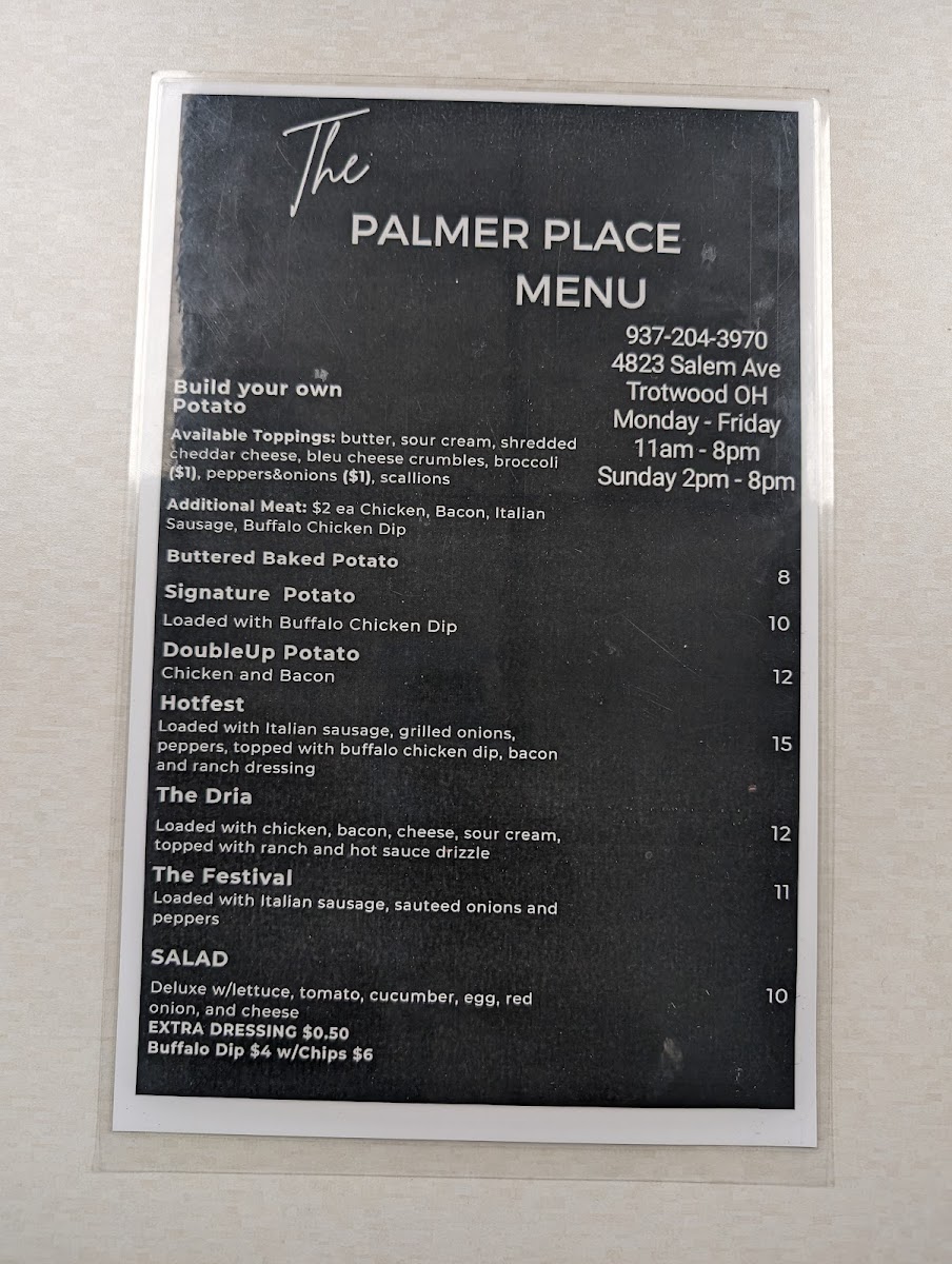 Whether you’re in the mood for a hearty potato, a fresh salad, or a comforting dip, The Palmer Place provides a variety of satisfying options, all at reasonable prices, making it a go-to spot for casual yet delicious meals in Dayton.